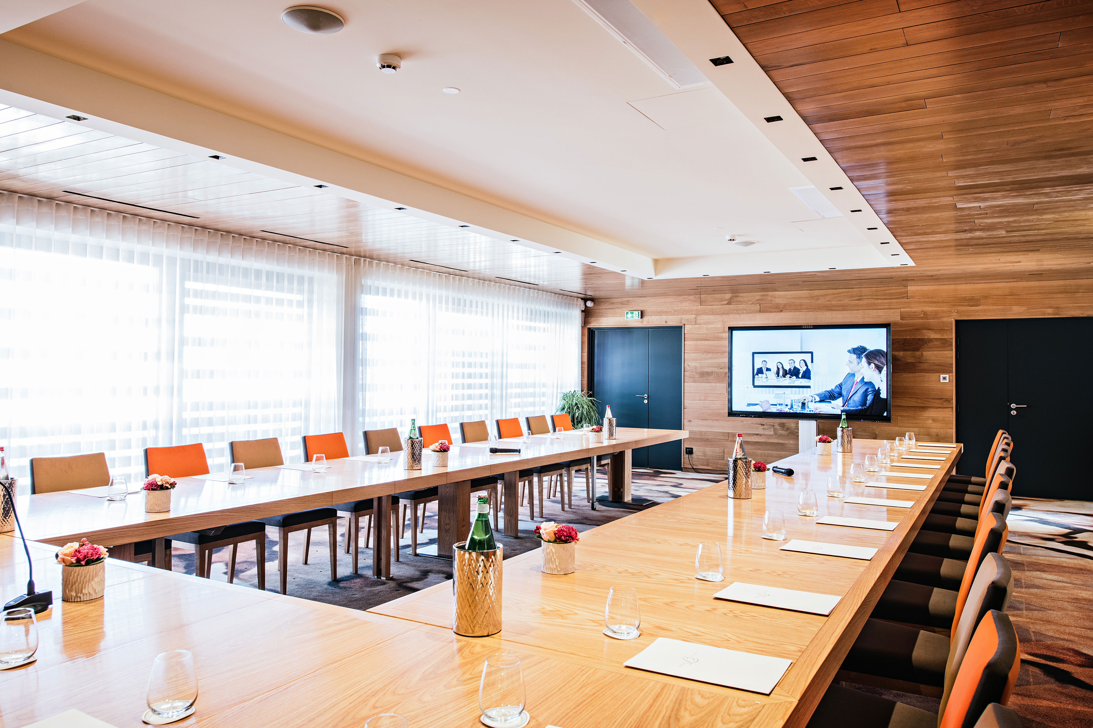 A 150 m² fully equipped room (paper board, touch screen, wifi, notepad, coffee & tea available).
